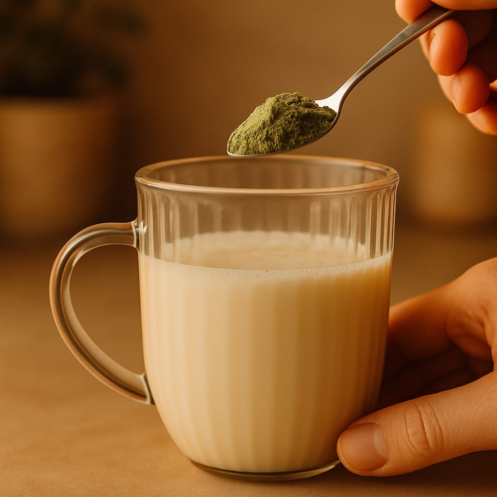 Rajoutez votre Latcha ! Dosez à votre convenance. On vous recommande une belle cuillère à café pour 150ml de lait.