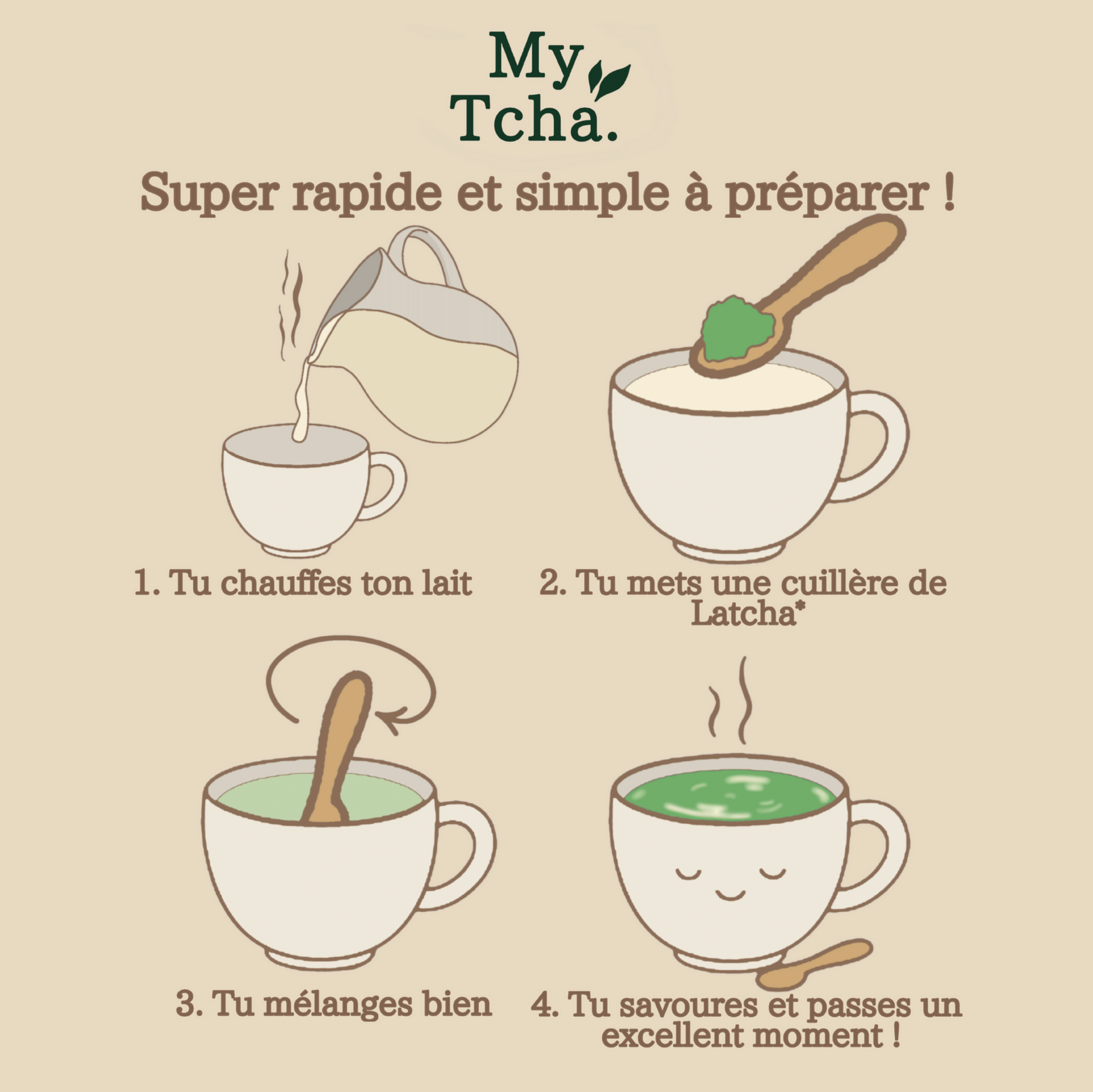 Rajoutez votre Latcha ! Dosez à votre convenance. On vous recommande une belle cuillère à café pour 150ml de lait.